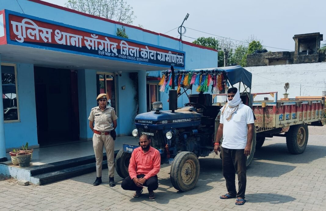 Kanwas News/सांगोद. नगर की पुलिस द्वारा अवैध बजरी खनन परिवहन के खिलाफ कार्यवाही करते हुये 01 ट्रेक्टर ट्रोली सहित 1 मुल्जिम को गिरफ्तार किया गया। पुलिस अधीक्षक जिला कोटा ग्रामीण करन शर्मा ने बताया की पुलिस मुख्यालय जयपुर द्वारा एवं पुलिस महानिरीक्षक कोटा रेंज, कोटा के द्वारा अवैध खनन, अवैध निर्गमन,अवैध भंडारण के विरुद्ध संयुक्त अभियान के तहत थाना सांगोद पुलिस टीम द्वारा अवैध खनन परिवहन की कार्यवाही करते हुये 1 ट्रेक्टर को बजरी (काली रेती) से भरी ट्रोली सहित 1 मुल्जिम को गिरफ्तार करने में सफलता प्राप्त की। अभियान के तहत अतिरिक्त पुलिस अधीक्षक कोटा ग्रामीण रविन्द्र सिंह के सुपरविजन में तथा वृत्ताधिकारी वृत्त सांगोद नरेन्द्र नागर के निर्देशन में थानाधिकारी हीरालाल पुनिया के नेतृत्व में विशेष टीमों का गठन किया गया। अवैध बजरी (काली रेती) खनन परिवहन की कार्यवाही करते हुये एक ट्रेक्टरअवैध बजरी (काली रेती) से भरी ट्रोली व एक मुल्जिम आकाश को पकड़ा।