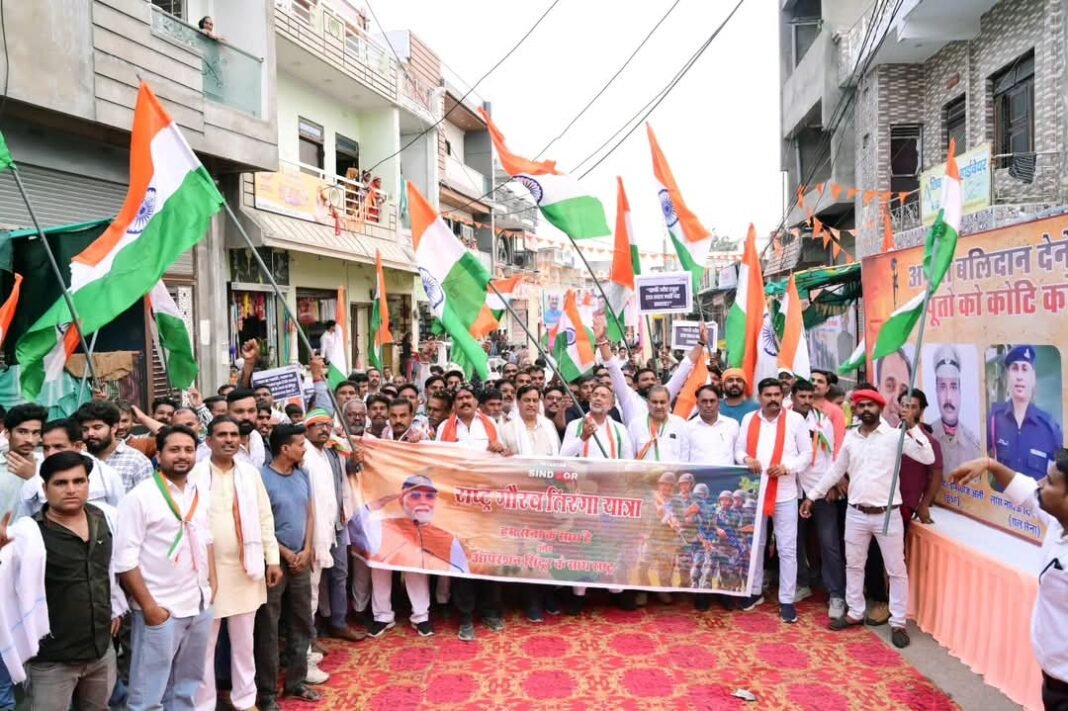 Kanwas News/कनवास. देवली व कनवास के भाजपा मंडल में ऊर्जा मंत्री हीरालाल नागर के नेतृत्व में सैनिकों के शौर्य और पराक्रम के सम्मान में राष्ट्र गौरव तिरंगा यात्रा निकाली गई। आसमान में गूंजते जोशीले नारों और चारों ओर लहराते भारत की आन बान शान के प्रतीक राष्ट्रीय ध्वज के बीच तिरंगा यात्रा को देवली से ऊर्जा मंत्री नागर के द्वारा रवाना किया गया। मुख्य मार्गों से पीसाहेड़ा, आवां, माधोपुर, आवां चौराहा होते हुए कनवास सुभाष सर्किल पहुंची। इस दौरान बड़ी संख्या में भाजपा कार्यकर्ता और राष्ट्रवादी नागरिक अपने दुपहिया और चौपहिया वाहनों के साथ रैली में सम्मिलित हुए। ऊर्जा मंत्री तिरंगा यात्रा में शामिल हुए। रास्ते में मंत्री नागर ने माधोपुर में मृतक संदीप शर्मा के घर पहुंच कर शोक प्रकट किया। तिरंगा यात्रा में बड़ी संख्या में महिलाऐं भी शामिल हुईं। नवयुवक दिल में देशभक्ति का जज्बा और हाथों में तिरंगा लिए विभिन्न गांवों के मार्गों से गुजरे तो पूरा माहौल राष्ट्रभक्ति के रंग में रंग गया। इस दौरान सैकड़ों की संख्या में आए कार्यकर्ताओं ने हाथों में तिरंगा थाम रखा था तो ‘वन्देमातरम्..’ और ‘‘भारत माता की जय’’ के नारों से आसमान गूंज रहा था। जगह जगह तोरण द्वार और पुष्पवर्षा से स्वागत किया जा रहा था। बीच बीच में ढोल पर युवकों की टोलियां थिरक रही थीं तो डीजे पर देशभक्ति फिल्मी गीतों से माहौल में देशभक्ति की बयार बह रही थी।