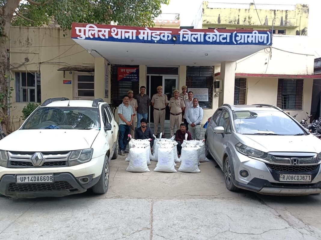 Kanwas News/कोटा. ग्रामीण के मोड़क थाना पुलिस ने देर रात को अवैध मादक पदार्थ के खिलाफ़ बड़ी कार्यवाही करते हुए 2 अंतर्राज्यीय तस्करों से लक्जरी कार में 1करोड 51लाख 500 रुपये का अवैध गंजा जप्त किया। पुलिस अधीक्षक सुजीत शंकर ने बताया, थाना मोडक क्षेत्र में बडी कार्यवाही करते हुऐ अन्तर्राज्यीय तस्कर नरेश धाकड पुत्र प्रभू लाल जाति धाकड उम्र 47 साल निवासी नयागांव थाना बीजोलिया जिला भीलवाडा, सैफ अली पुत्र पप्पू अली जाति फकीर मुसलमान उम्र 28 साल निवासी पुरोहितों का खेडा थाना बीजोलिया जिला भीलवाडा को गिरफ्तार कर उनके कब्जे से अवैध मादक पदार्थ गांजा 303 किलों, 120 ग्राम एवं तस्करी व एस्कॉर्ट में प्रयुक्त दो लग्जरी कारों को जप्त करने में सफलता प्राप्त की। कैथून थानाधिकारी संदीप शर्मा, मोड़क थानाधिकारी उत्तम सिंह, सायबर सैल प्रभारी भूपेन्द्र सिंह एवं जाप्ते की विशेष टीम का गठन कर जिले से गुजरने वाले राष्ट्रीय राजमार्ग 52 पर अवैध मादक पदार्थ तस्करी की लगातार सूचनाऐं मिलती रहती है । वहीं रात्री को गश्त एवं सूचना प्रभारी भूपेन्द्र सिंह की टीम मोड़क व सुकेत क्षेत्र में रवाना हुए। इसी दौरान थानाधिकारी उत्तम सिंह द्वारा मय जाप्ता कर दरा नाल के समीप नाकांबदी प्रारंभ की गई। नाकाबंदी के दौरान आने जाने वाले वाहनो को रोककर चैकिंग की जा रही थी, “तभी एक लग्जरी कार को रोक कर चैक करना चाहा तो उक्त कार चालक अपनी कार को ढाड के मौके से एकदम तेज गति में भगाकर ले गया तथा ढाड के मौके से करीब 600-700 मीटर आगे जाकर एनएच-52 पर अपनी कार को रोका तथा रात के अंदरे का फायदा उठाकर कार में बैठे तीन व्यक्ति भागने में सफल हो गये उसी दौरान एक लग्जरी कार झालावाड की तरफ से आती हुयी नजर आयी, जो नाकाबंदी व पुलिस जाप्ते को देखकर कार चालक ने अपनी कार को तेजगति से भगाया जिससे उक्त कार एनएच-52 पर खड़े हुये ट्रकों व ट्रेलरों से टकराती हुई जाने लगी। जिसको घेराबंदी कर बमुश्किल से डिटेन किया व चेक किया” तो कार में दो आदमी बैठे हुये थे, जिनको नीचे उतारकर चालक से नाम पता पूछा तो चालक ने घबराता हुआ दिखा। कार में बैठे अन्य व्यक्ति से नाकाबंदी व पुलिस जाप्ते को देखकर कार एकदम तेजगति से चालने बाबत पूछताछ की तो कोई संतोषप्रद जवाब नही दिया,इस पर संदेह होने पर कार को चेक किया तो कार में अलग अलग पेकिटों में गांजा भरा हुआ मिला जिनको नियमानुसार चैक कर एवं नापतोल किया तो गांजे का कुल वजन 303 किलो 120 ग्राम हुआ।